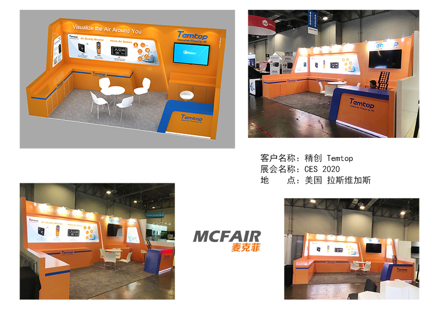 厦门麦克菲运用独特设计创意为Temtop打造集美观与实用于一体的高端展台,以开放、包容的姿态迎接前来参观、洽谈和采购的观众,设计风格以简洁明快为主,热情洋溢的橙色搭配上沉稳的蓝色,让整个展台更加动感活泼,传达Temtop员工勇攀高峰,彰显企业积极向上的风貌。麦克菲设计师合理规划展台区域布局,设专区集中展示Temtop最新科技成果,配上大型灯箱海报图片突出产品高性能的特点,让观众对展品有更加全面的认识。